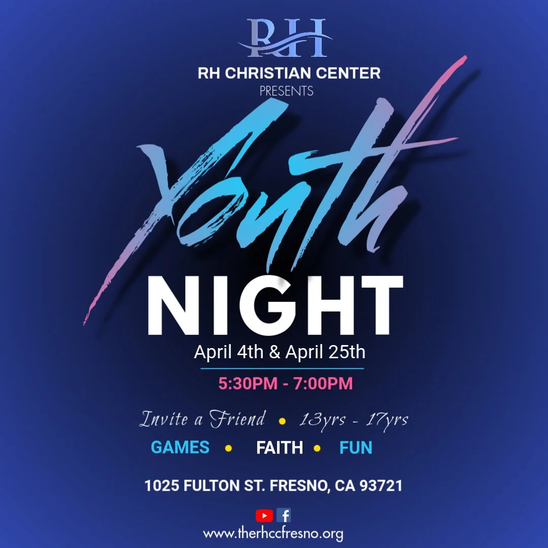 Join us Friday, April 25th at 5:30 PM for RH Christian Center Youth Nights! Come explore God's Word and grow in every area of life—spiritually, mentally, physically, and even financially. Don't miss this opportunity to strengthen your faith and connect with others!